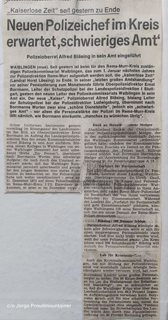Waiblinger Kreiszeitung vom 14.08.1974: Es gab einen neuen Polizeichef in Waiblingen.