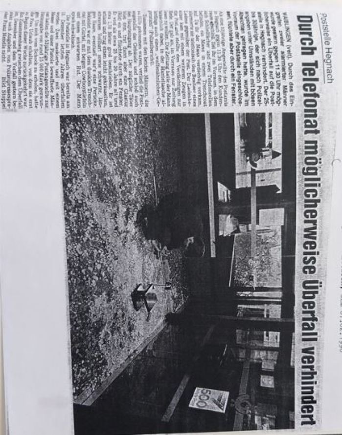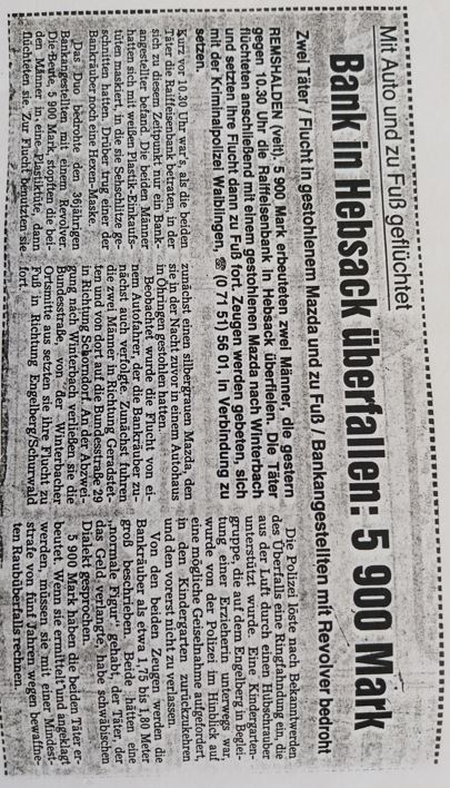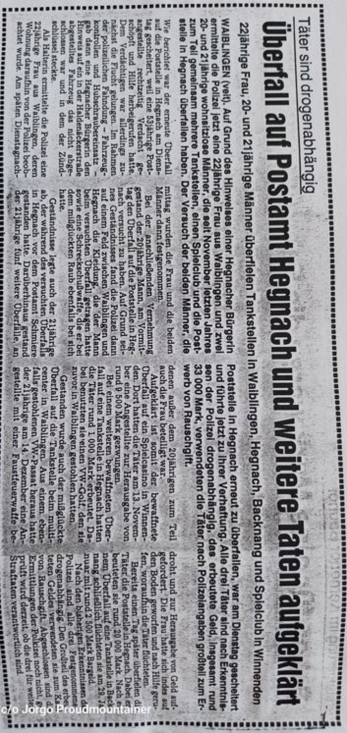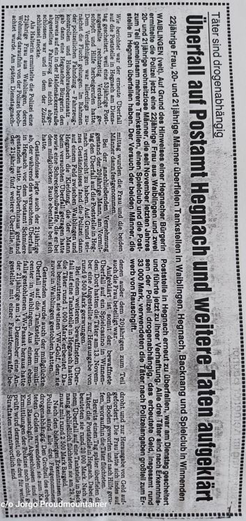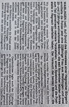 Waiblinger Kreiszeitung vom 08.02.1990: Überfall auf Tankstellen, Spielclub und die Poststelle Hegnach geklärt....