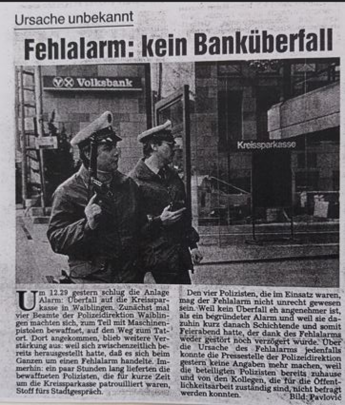 WKZ vom 25. 01.1990: Fehlalarm bei der Kreissparkasse in Waiblingen....