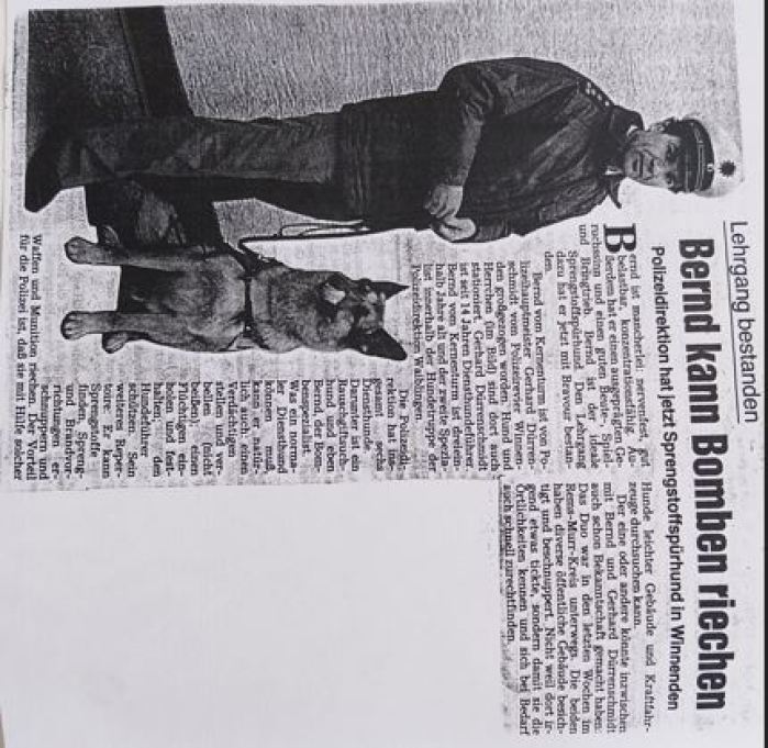 WKZ vom 02.02.1989: "Bernd vom Kernerturm" hat seine Ausbildung zum Drogenspürhund abgeschlossen. Er ist mit seinem "Chef" in Winnenden stationiert.
