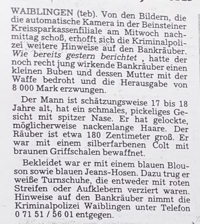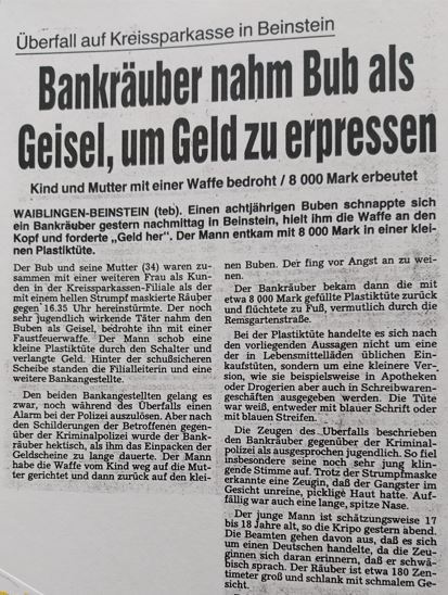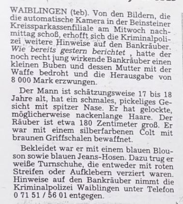 WKZ vom 13.01.1989: Überfall auf die Kreissparkasse in Beinstein....