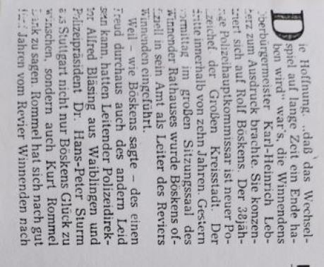 Winnender Zeitung vom 11.03.1988: Kurt Rommel geht- Rolf Böskens kommt! Neuer Revierführer für Winnenden...