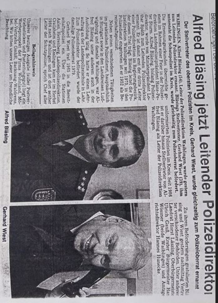 WKZ vom 22.01.1988: Alfred Bläsing jetzt Leitender Polizeidirektor. Gerhard Wiest zum Polizeioberrat ernannt....
