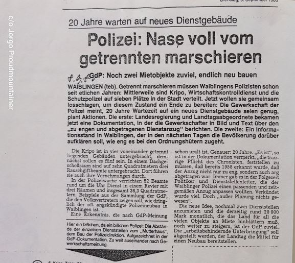 Waiblinger Kreiszeitung vom 09.09.1980: Bereits 20 Jahre wartet die Polizei in Waiblingen auf ein neues Dienstgebäude. Die Organisationseinheiten sind teilweise in Waiblingen verstreut....