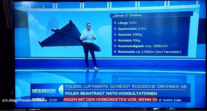 Bei den mindestens 12 Drohnen, von denen welche in Polen abgeschossen wurden handelte es sich um die „Geran-2“ Drohne, mit einer Spannweite von 2,5 Meter, Gewicht 200 kg, Nutzlast 50 kg,